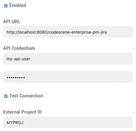 The base URL of the PM integration service. If you have deployed the JIRA integration in Tomcat, the URL will likely be http://localhost:8080/codescene-enterprise-pm-jira.