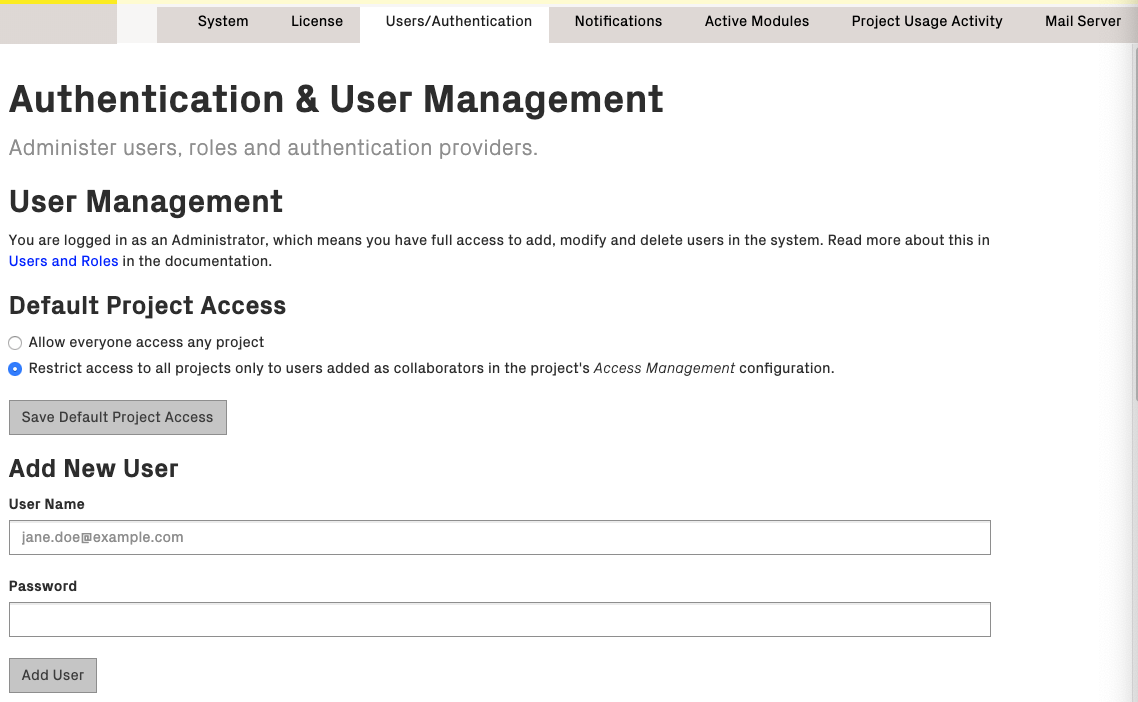 By default, CodeScene operates with an internal user database. Adding internal users requires Admin privileges.