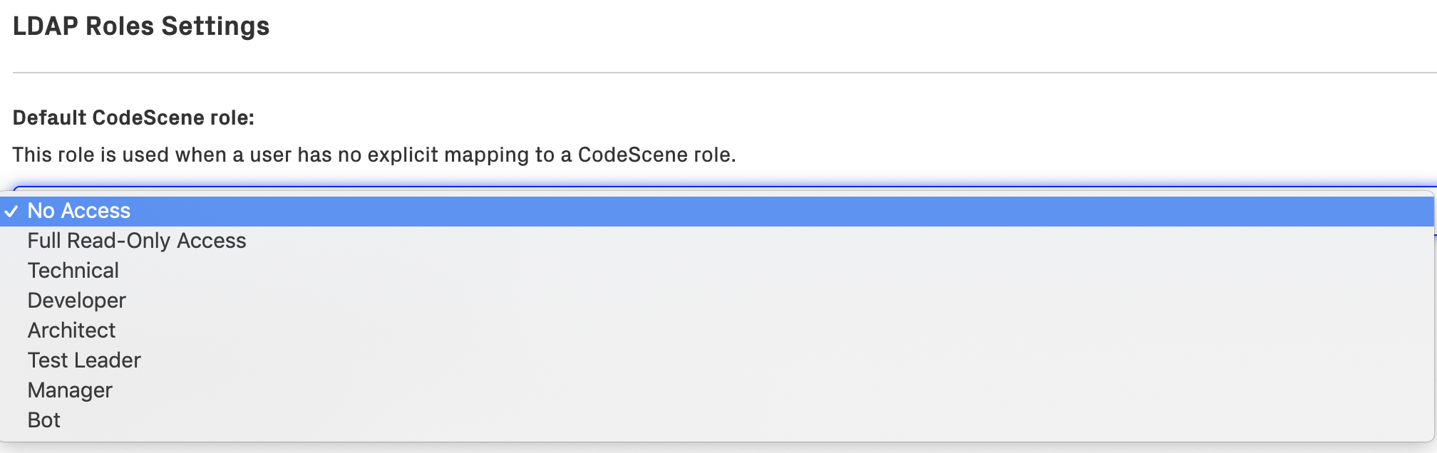 If no matching CodeScene role is found for the LDAP user, the value of “Default CodeScene role” is used. By default, this is set to Full Read-Only Access, but it can be changed to a more restrictive role or even a special No Access role which will deny access to all LDAP users who aren’t mapped explicitly. You can see this in Fig. 242.