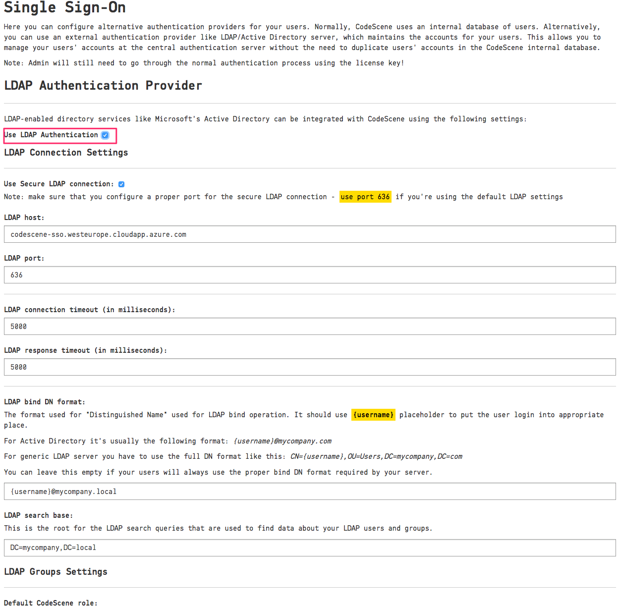 You will need to configure the “LDAP host” address and the “LDAP search base” settings. CodeScene provides default values for the remaining settings, e.g. port and connection timeouts.