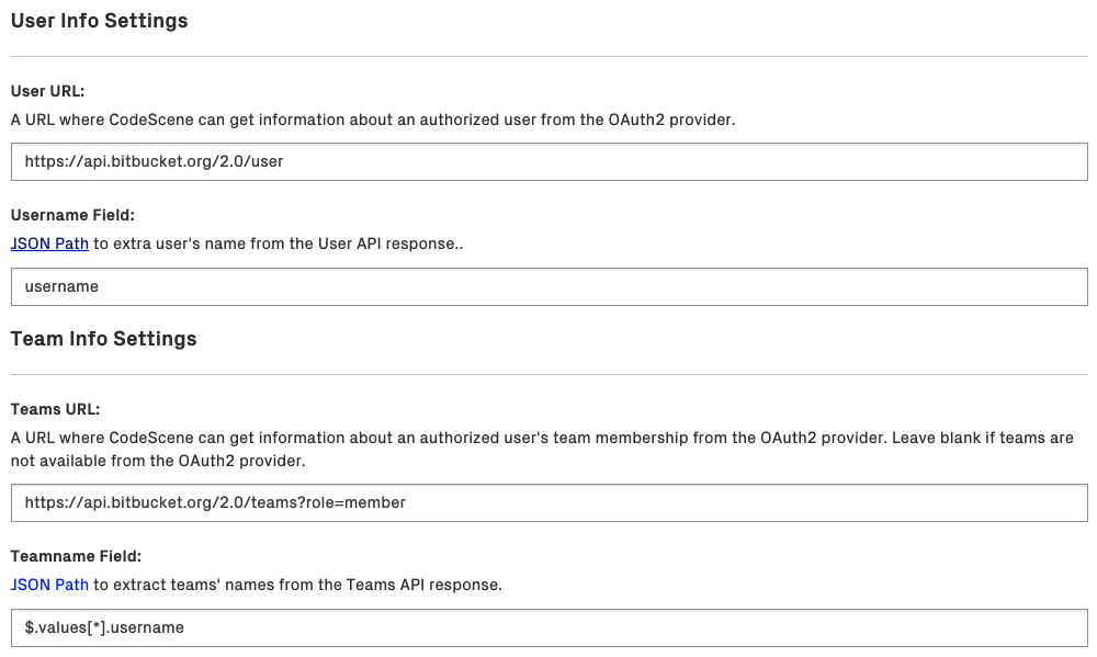 The Team Name field is a JSON Path that selects names of all teams in the teams API response. Check the typical settings for providers. Some providers return teams as a top-level JSON array while others (like BitBucket and Azure AD) return them wrapped in another top-level JSON object. Yet another providers (e.g. PingID’s groups attribute) don’t provide a proper list but instead return a simple string where groups are separated by a comma (CodeScene has special support to handle this scenario - so for PingID you would just use $.groups).