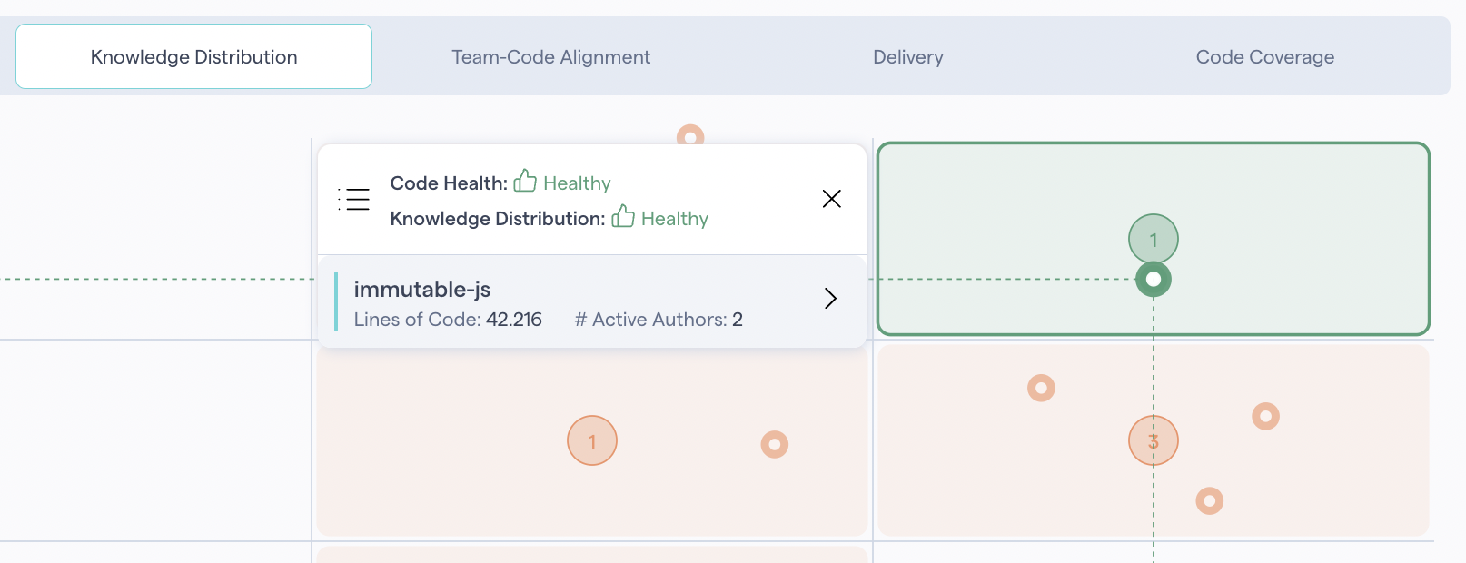 Successful software development largely depends on effective knowledge sharing within the organization. A team loses collective knowledge when a code contributor leaves. Knowledge Distribution measures the current state of Code Familiarity – how much of the code is written by the current team - as well as the risk in terms of Knowledge Islands, which represent potential key personnel risks.