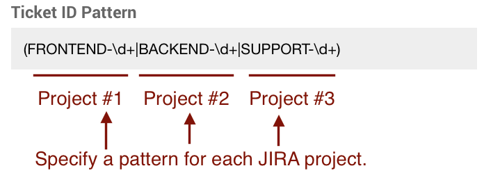 For example, let’s say you integrate with three projects. Each project will have a JIRA ID like FRONTEND-123, BACKEND-765 and so on. In this case you want to use the whole JIRA ID as a Ticket ID to ensure that they are unique. In addition, you need to specify a regular expression that will match all your possible JIRA ID ranges