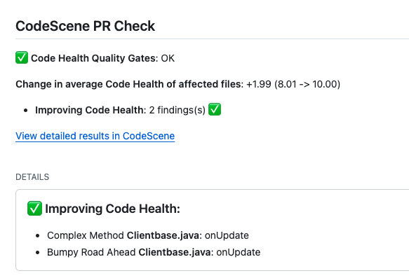 Fig. 133 An example on CodeScene’s quality gates where Details contain actionable feedback (example from CodeScene’s GitHub integration).¶